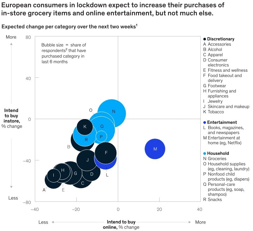 İnsanlar karantina ile birlikte zorunlu olmadıkça dışarı çıkmak istemiyor. Yine mayıs ayında yayınlanan McKinsey & Company’nin veri görselleştirmesi öne çıkan istatistikler arasında yer alıyor. Ankete katılan müşteriler yiyecek ve Netflix gibi çevrimiçi eğlence dışındaki her şeye daha az harcama yapmayı düşündüklerini paylaşıyor.