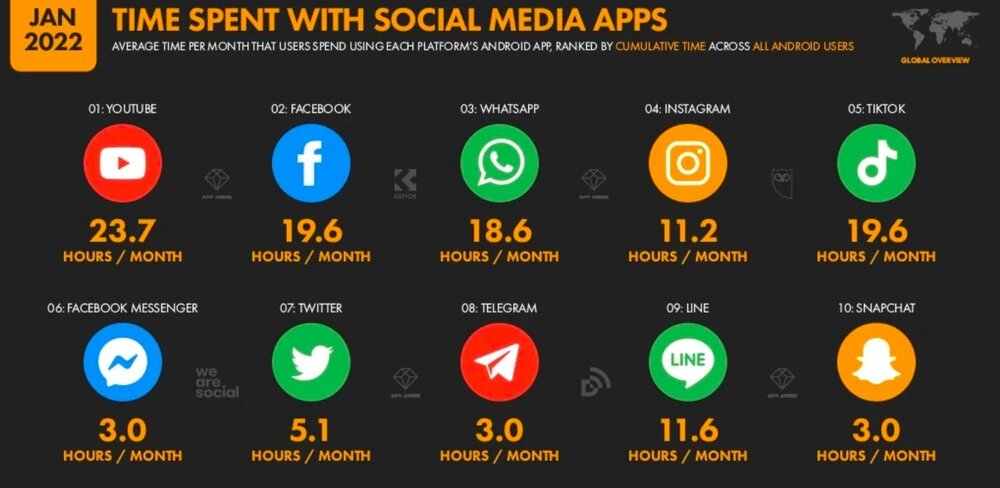 Kullanıcı sayısı artıkça insanların sosyal medyada geçirdiği vakit de artıyor. Rapora göre insanlar önceki yıla göre yüzde 1,4 artışla günde yaklaşık 2,5 saatini sosyal medya platformlarında geçiriyor. Facebook dünyada en çok kullanılan sosyal medya olmaya devam ederken onu YouTube ve WhatsApp takip ediyor. Ancak YouTube’un kullanıcı sayısının Facebook’a oranla iki kat hızlı büyüdüğünü ve arayı kapattığını söyleyebiliriz. WeChat’in dördüncü sırada yer almasını ise Çin’in nüfusuyla bağlantılı olduğu söylenebilir. Çin dünyadaki toplam internet kullanıcılarının ortalama yüzde 20’sine ev sahipliği yapıyor.