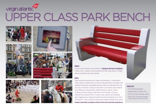 Virgin Atlantic sağladığı uçuş konforunu sıradan bir ortamda da yaşatmak için New York’ta bir bankı bir uçak koltuğunu andıran banka çeviriyor, biri oturduğu anda da günü markanın vaad ettiği türden bir uçuş deneyimine dönüşüyor. Önden yemek ve şarapla masası donatılan ‘kurban’ daha sonra film izleme deneyimi yaşarken biraz filme kendisini çok kaptırmak durumunda kalıyor çünkü film karşısında gerçekten oynayan oyuncularla ayağına geliyor.