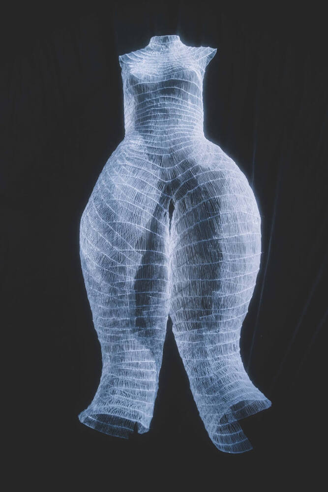 Seiran Tsuno’nun canlı renklerden oluşan hayalet giysileri, giyen kişinin bedenini maskeliyor ve bu yolla insan vücudunun bağlamını yeniden inşa ediyor. Tasarımlar, vücudun önünde havada duruyor izlenimi veren hayalet kafesler gibi. Bu soyut kafesler, insan silüetini bozulmaya ve değişime uğratıyor. Üstelik son derece minimalist ve sessiz bir yaklaşımla. Sadece 3B kalemlerle çalışan tasarımcı, bir elbiseyi beş kişilik bir ekiple yaklaşık bir haftada tamamlıyor.