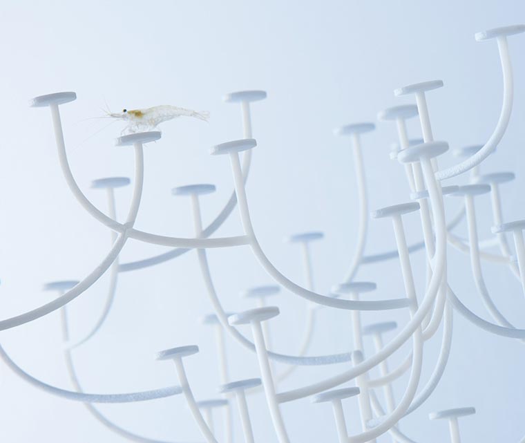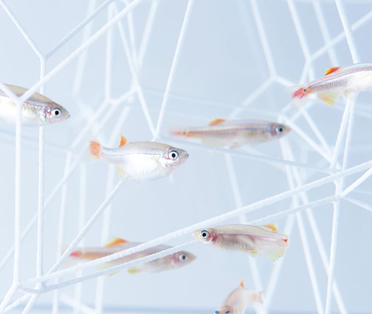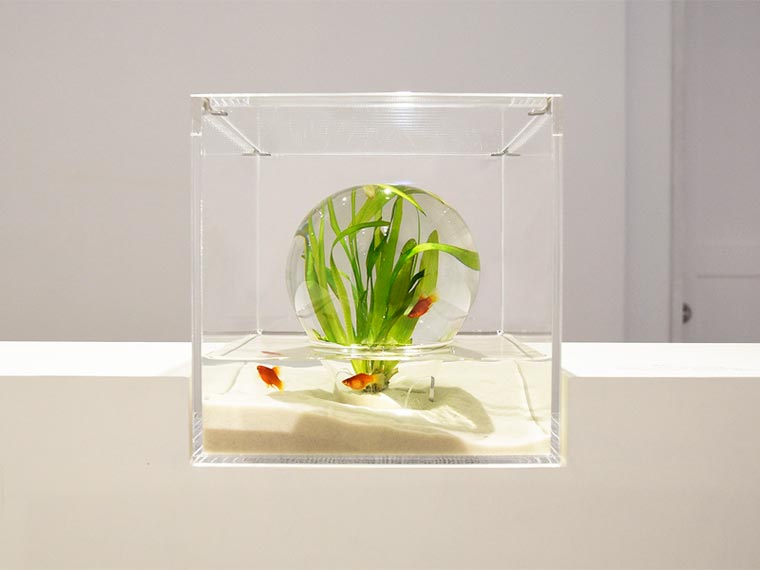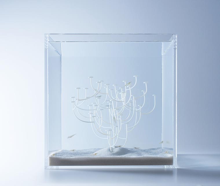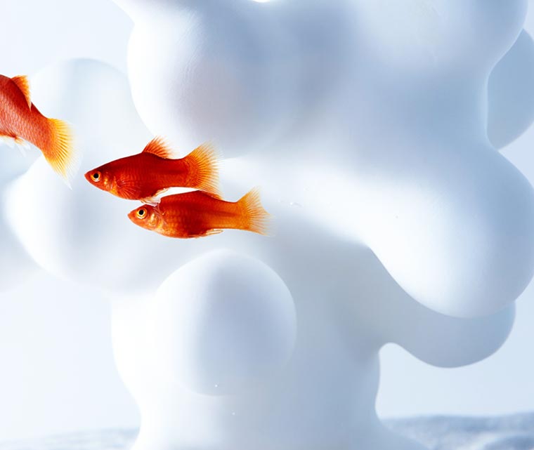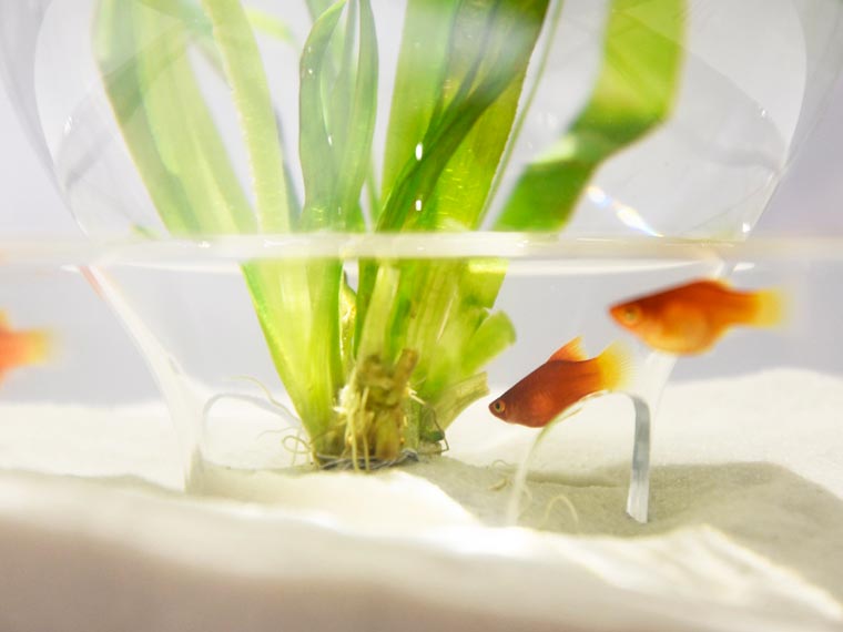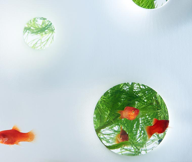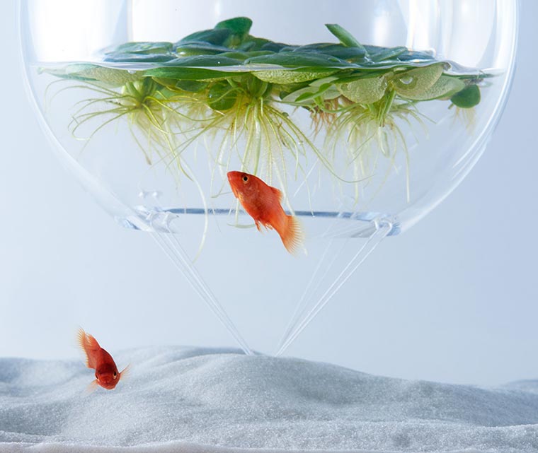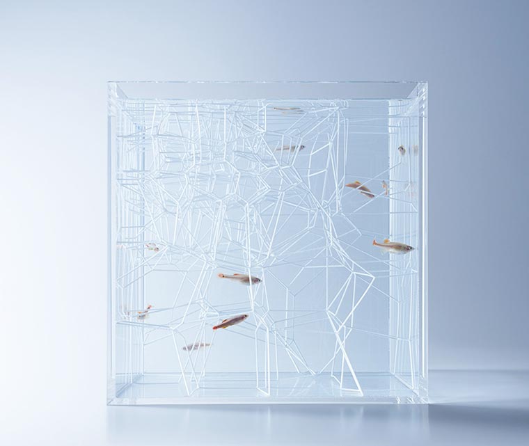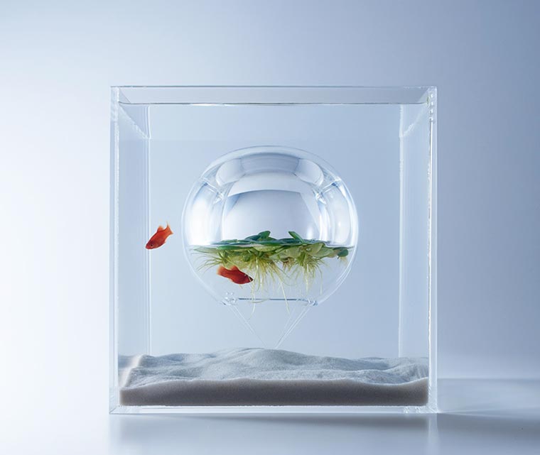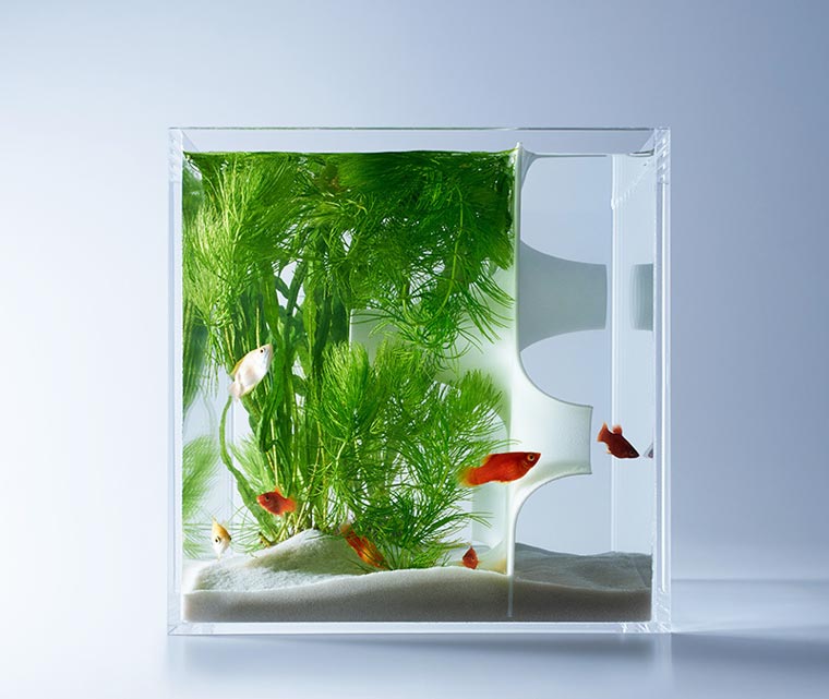 Japon tasarımcı Haruka Misawa, mimari enerjiyi ve canlılığı balık akvaryumuna taşıdı ve “Waterscapes” (Su altı Kaçamakları) serisini yarattı. Misawa’nın suyun kaldırma kuvvetinden yararlanarak tasarladığı modern ve yaratıcı transparan akvaryumlarda, balıkların korunaklı bir şekilde içinde yüzebildiği ikinci bir cam fanus, su bitkileri ve balıkların arasından geçebildiği veya üstünde durup dinlenebildiği çeşitli geometrik şekillerdeki tasarımlar yer alıyor. Muntazam bir şekilde yerleştirilen beyaz şekiller, su altında balıkların uyum sağlaması için yeni alanlar yaratıyor.