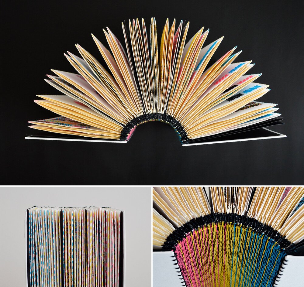 Her sayfada, geometrik olarak yerleştirilmiş renk örneklerinin yanı sıra CMYK değerleri hakkında elle yazılmış ayrıntılar yer alıyor. Kitabın sayfalarını birbirine bağlayan omurgası da macentadan camgöbeğine uzanan canlı bir gradyandan oluşuyor.