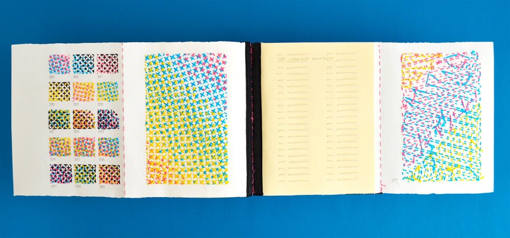XXXX Swatchbook birincil, ikincil ve üçüncül renkleri; bunların bir araya gelmesinin son pigmenti nasıl etkilediğini gösteren iki düzine kombinasyonunu içeriyor. Katalogda ayrıca zengin gradyanların tam spektrumuna yer veriyor. Baskı odaklı kitapta; elle yapılmış 219.647 dikişten oluşan 4 temel ton, 16 element ve 400 renk örneği yer alıyor. Kataloğun tamamlanması yaklaşık 6 yıl sürmüş.