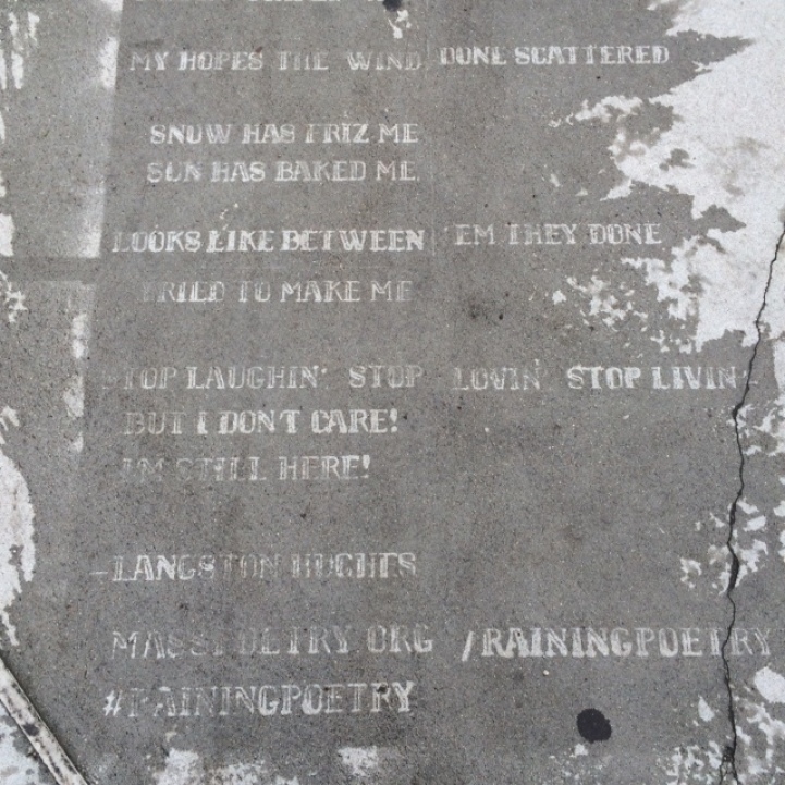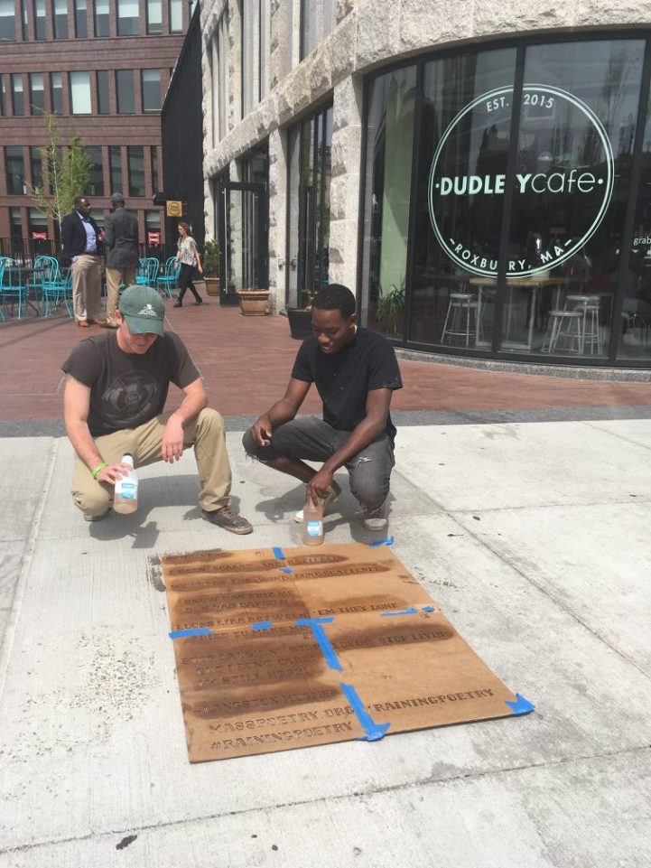 Yağmur yağınca ortaya çıkan sokak sanatı eserlerinin, FIAT ve Mazda’nın yaptığı kampanyaların ardından bu kez Mass Poetry organizasyonu Boston Belediyesi ile işbirliği yaparak Raining Poetry projesini uygulamaya koydu. Proje kapsamında su tutmayan, silikon içerikli görünmez bir spreyle kaldırımlara yazılan dörtlükler ve soneler yalnızca yağmur yağınca ortaya çıkıyor.