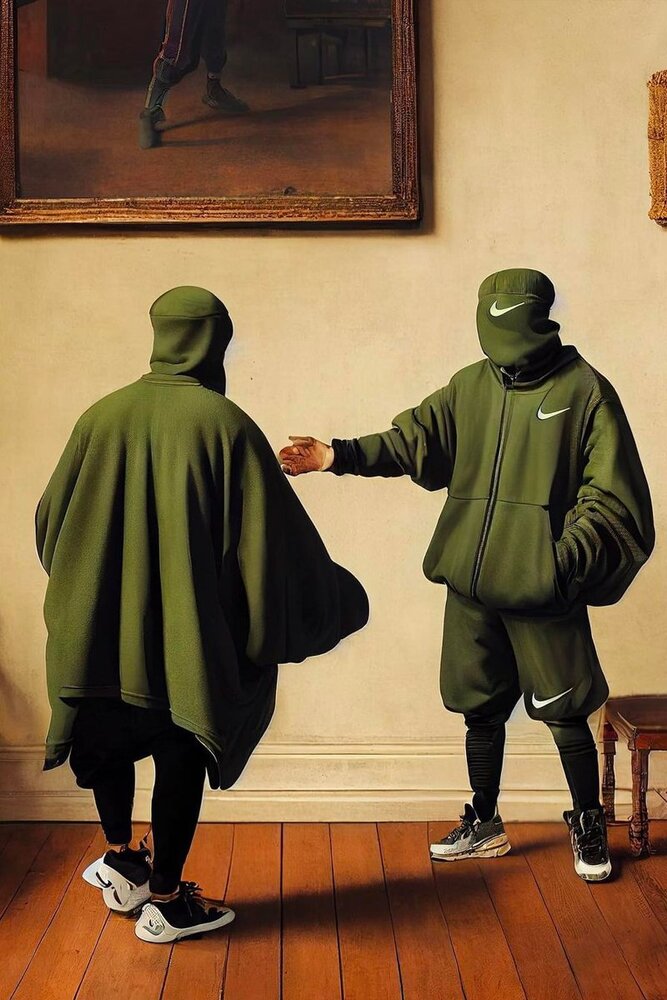 Bir moda trendi yanlış zamanda ortaya çıksaydı ne olurdu? Örneğin 1800’lü yılların gotik tarzdaki fırfırlı elbiselerini günümüz sokaklarında görmeye başlasaydık nasıl bir tablo ile karşılaşırdık? Geçmişi günümüze değil ama günümüz modasını geçmişe gönderen yapay zekâ sanatçısı ve yaratıcısı Str4ngeThing, Nike’nin sokak giyim stilini Rönesans dönemine taşıdı. Nike giysilerini taşıyan modelleri Rönesans döneminin ünlü eserlerine yerleştiren sanatçı, yapay zekâ ile zaman yolculuğuna yeni bir yorum kattı.