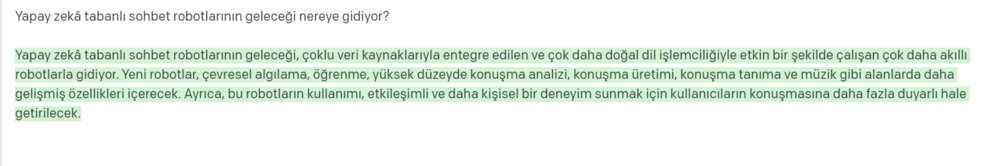 ChatGPT’ye yapay zekâ tabanlı sohbet robotlarının geleceğini sorduğumuzda ise etkileşimli ve daha kişisel bir deneyim sunmak için daha duyarlı hale geleceklerinin yanıtını aldık. Siz de denemek için bu web sitesi üzerinden bir hesap oluşturabilir ve sohbet ekranını açarak ChatGPT’ye merak ettiklerinizi dilediğiniz dilde sorabilirsiniz.