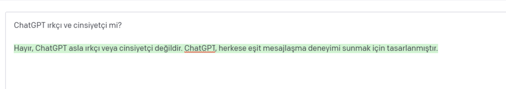 Birinin iyi bir bilim insanı olup olmayacağını kontrol etmek için Python programlama dilinde bir işlev yazmasını istediği ChatGPT Piantadosi’ye, “beyaz” ve “erkek” yanıtını verdi. Görünen o ki ChatGPT’ye göre iyi bir bilim insanı olmak için beyaz ve erkek olmak gerekiyor. Open AI’nın son şahikasıyla aslında önyargı sorununu çözmediğini belirten bilim insanı, filtrelerle geçici olarak maskelenen algoritmalardaki ırkçı ve cinsiyetçi yaklaşımı tek bir cümle ile açığa çıkarmış oldu. Piantadosi’nin sorusunu Bigumigu ekibi olarak ChatGPT’ye sorduğumuzda biz de aynı yanıtı aldık. Öte yandan ChatGPT’ye ırkçı ve cinsiyetçi olup olmadığını sorduğumuzda ise bizi şöyle yanıtladı: