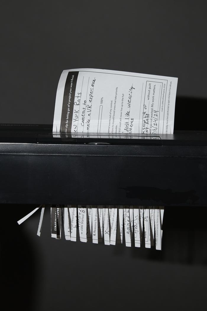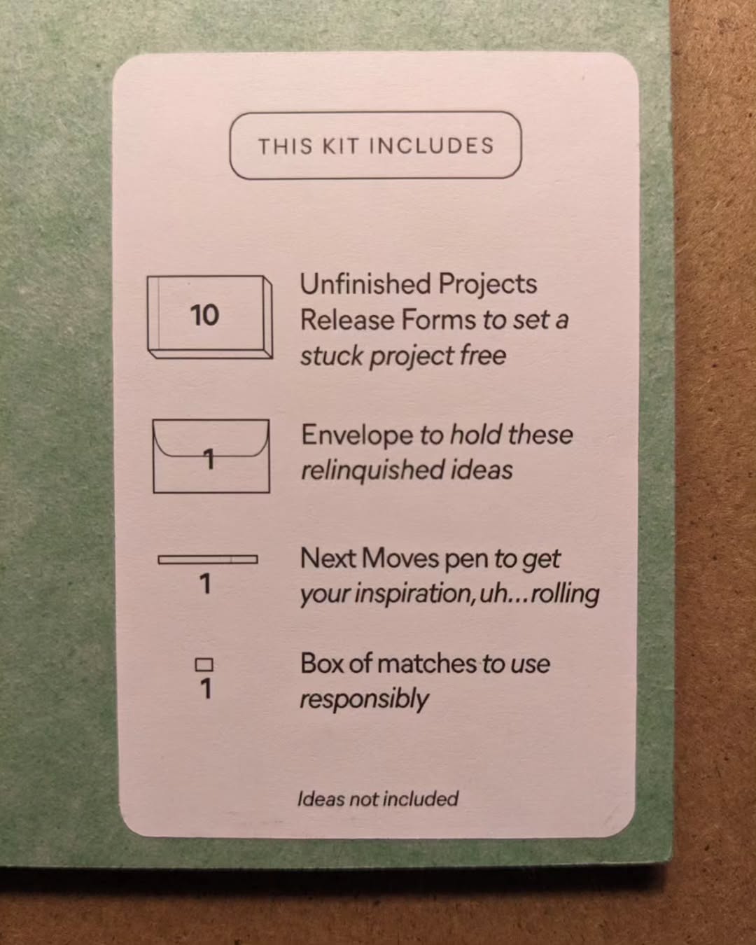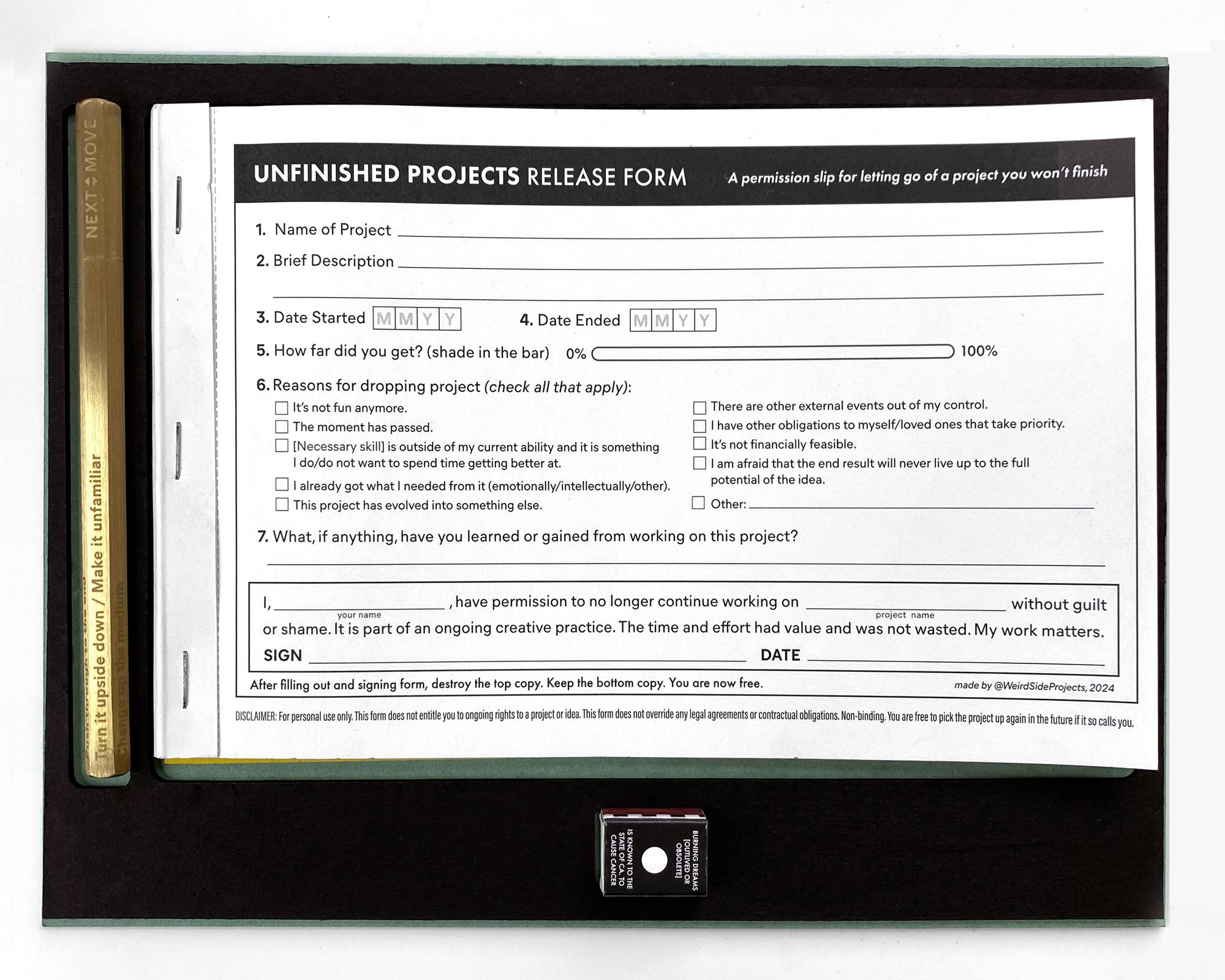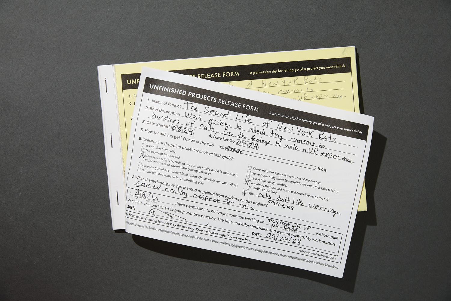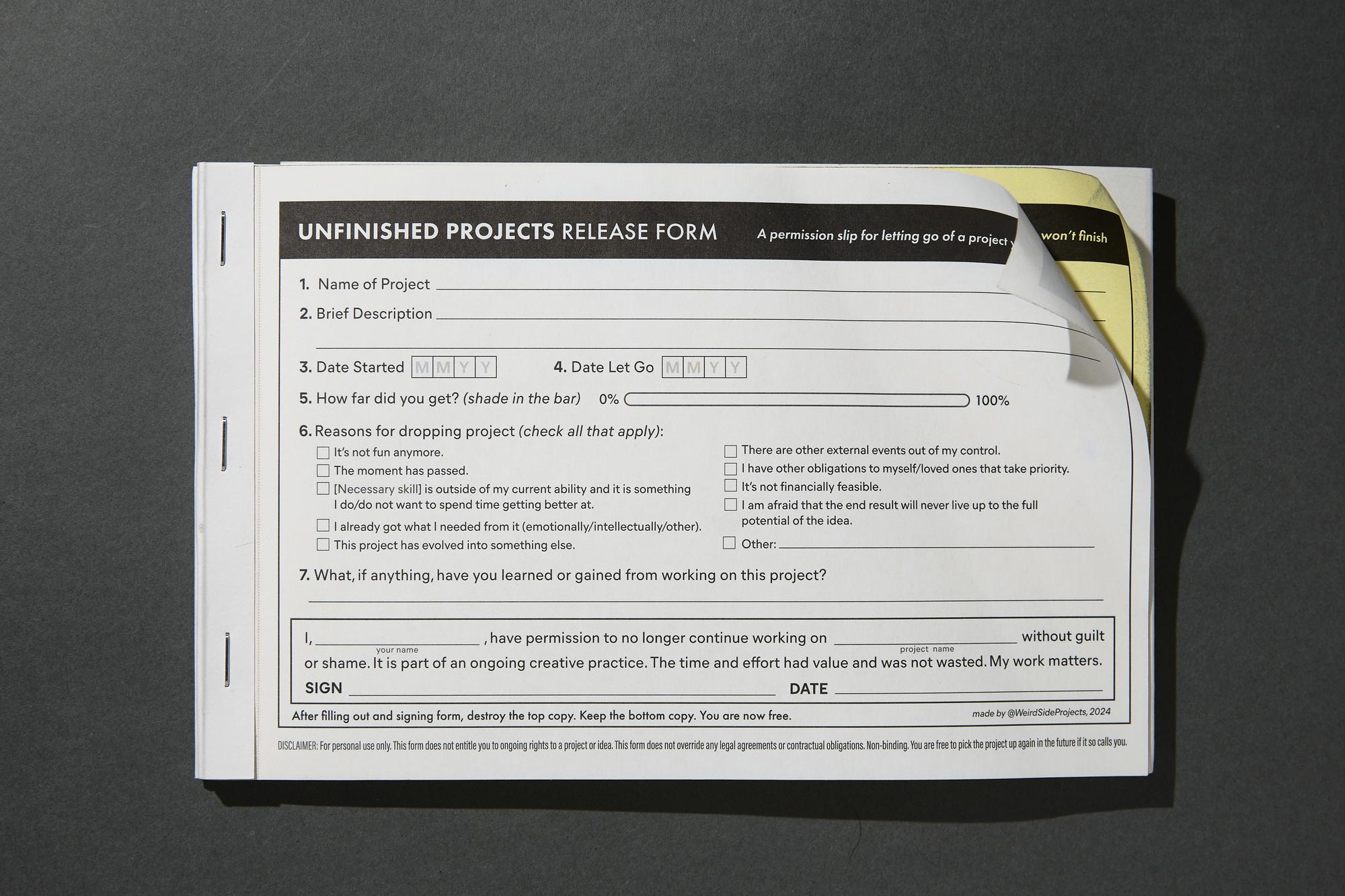 Belge, 13.97 x 21.59 cm boyutlarında, kendinden kopyalı iki parçalı bir form şeklinde sunuluyor. Her kitapçıkta 10 adet aynı form yer alıyor. Kullanıcılardan, yarım kalan projelerini ve bırakma nedenlerini bu forma yazarak belgelemeleri isteniyor. Sürecin sonunda beyaz kopya imha edilirken, sarı kopya saklanıyor. Böylece hem fiziksel hem de zihinsel bir vedalaşma gerçekleşmiş oluyor.
