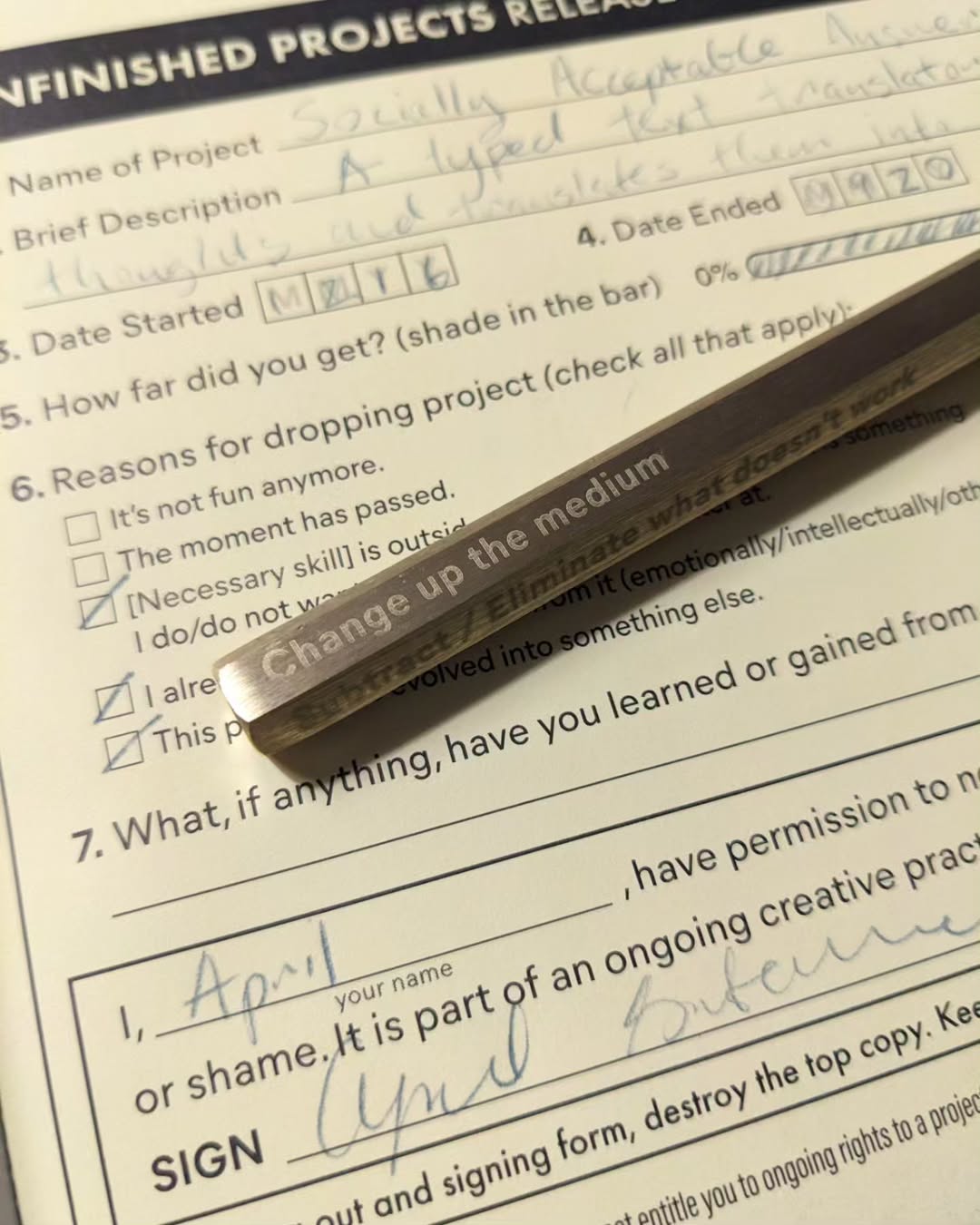 April Soetarman; tamamlanmamış yaratıcı projelere duygusal ve resmi bir veda imkânı tanıyan yeni çalışması “The Unfinished Projects Release Form” ile yaratıcıları, içlerini kemiren faydasız düşüncelerden kurtulmaya davet ediyor. “Yarım Kalan Projelerden Vazgeçme Formu” anlamına gelen belge, artık sürdürülemeyen projelere teşekkür ederek bırakmak isteyen kişiler için kendi kendilerine sunacakları bir tür “izin kâğıdı”.