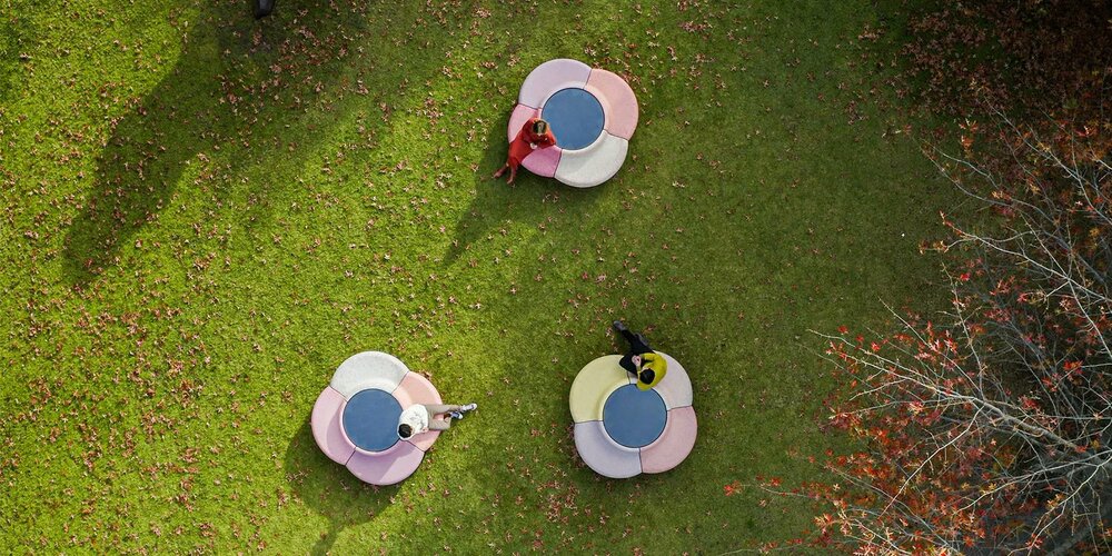 Bankların havadan görünümü, 60’ların çiçek grafiklerini anımsatıyor. Bu retro estetiğe ve hisse ek olarak çevre dostu özellikler de barındırıyor. Gömülü güneş panelleri aracılığıyla güneş ışığının toplanması ve yapımında geri dönüştürülmüş plastik kullanılmış olması gibi çağdaş sürdürülebilirlik değerlerine uyumlu özelliklere sahip. Banklar, ömürlerini tamamladıktan sonra da geri dönüşüm imkanı sunan kalıplanmış Düşük Yoğunluklu Polietilenden (Low-density Polyethylene / LDPE) yapılmış.