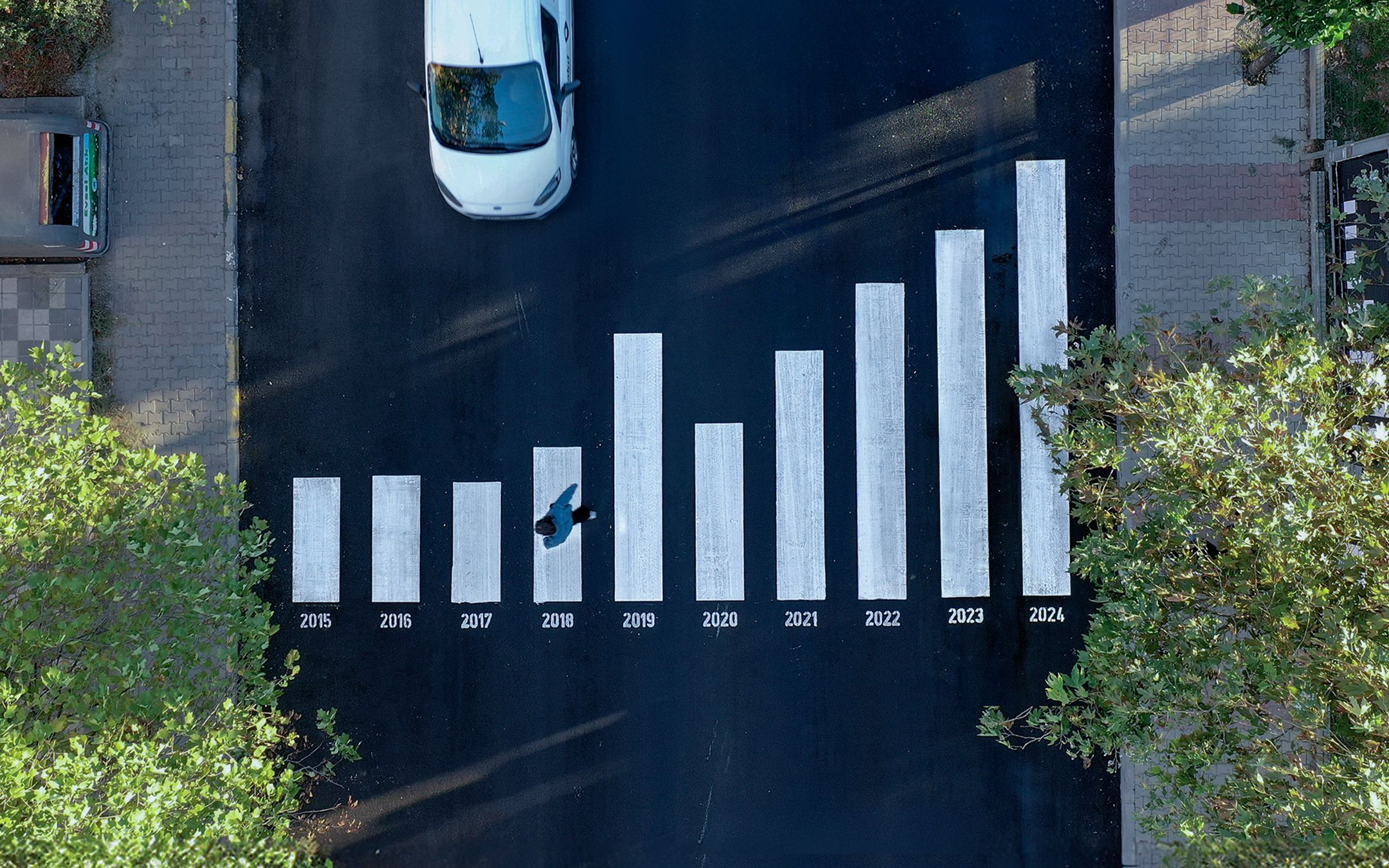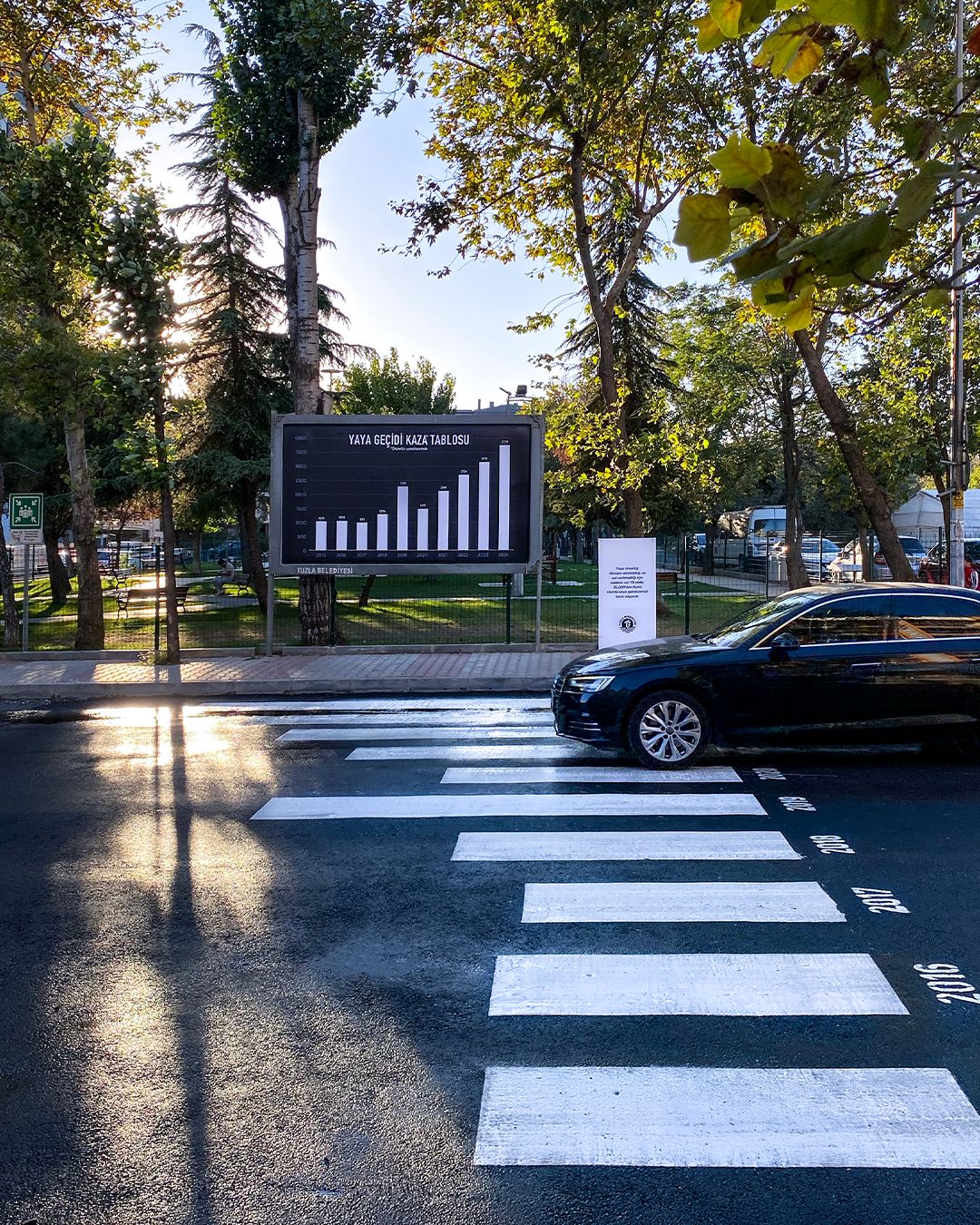 Kampanya Tuzla’daki bir yaya geçidinin şeritlerini bir istatistik grafiğinin kolonlarına dönüştürerek 2015’ten günümüze veriyi paylaşıyor.