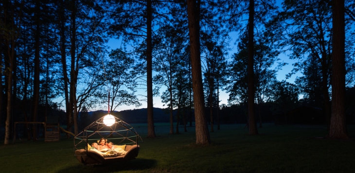 Yukarıdan asılmış büyük bir kafes görünümündeki Kodama Zome, içinde hem yatmak, hem oturmak için oldukça geniş ve rahat alana sahip bir açık hava mobilyası.