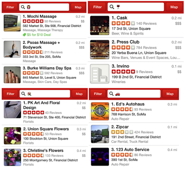 Yelp kullanıcıları, sitede aratmak istediği konuyu uzun uzun yazmak yerine sadece konuyla ilgili suratikonunu kullanarak arama yapabilecek. En basit örnek olarak, site üzerinden çiçekçi ararken sadece çiçek ikonunu kullanmanız yeterli olacak.