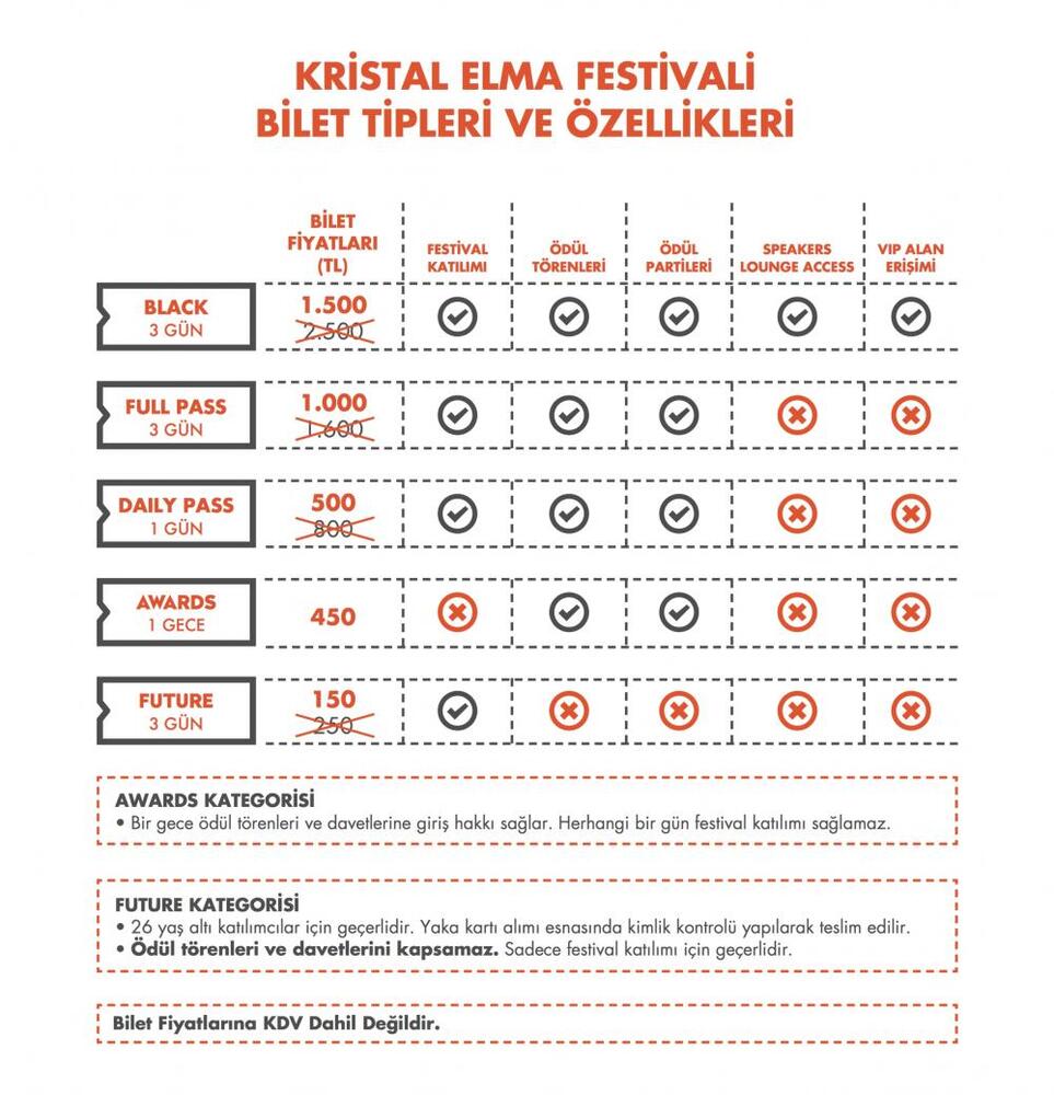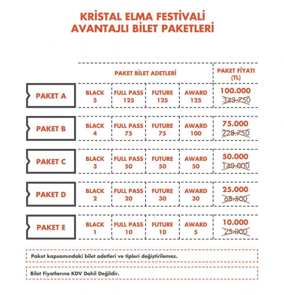 Bireysel biletlerde %40 indirim uygulanırken hazırlanan paketlerle marka ve ajansların toplu alımları içinse %70’e varan avantajlar sağlanıyor. Böylelikle Kristal Elma, festivalin gelmiş geçmiş en ekonomik bilet bütçelerini bu yıl katılımcılarına sunuyor.