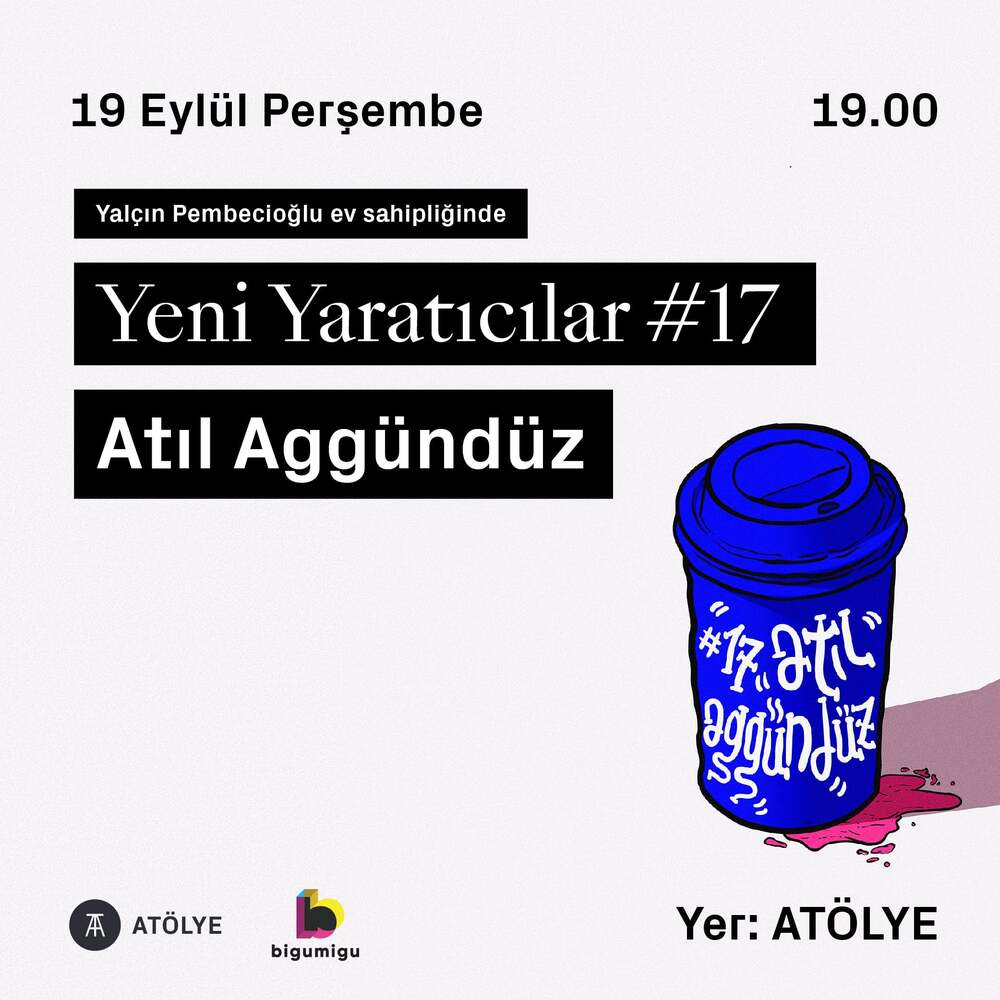 19 Eylül Perşembe günü Bigumigu’nun eş-kurucusu ve yayın yönetmeni Yalçın Pembecioğlu ile sohbet formatında ve ATÖLYE’de gerçekleşecek olan Yeni Yaratıcılar etkinliği buluşmasında Atıl Aggündüz’ün yaratma sürecindeki evrenine ortak olacağız ve yaratıcı çalışmalarının sürecini kendisinden dinleyeceğiz.