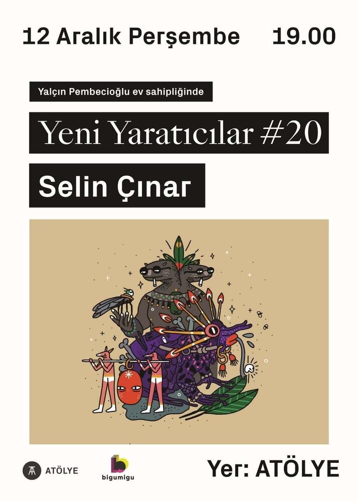 12 Aralık Çarşamba günü Bigumigu’nun eş-kurucusu ve yayın yönetmeni Yalçın Pembecioğlu ile sohbet formatında ve ATÖLYE’de gerçekleşecek olan Yeni Yaratıcılar etkinliği buluşmasında Selin Çınar’ın yer aldığı projeleri, yaratma sürecinde izlemiş olduğu yolu ve yapmış olduğu işleri kendisinden dinleyeceğiz