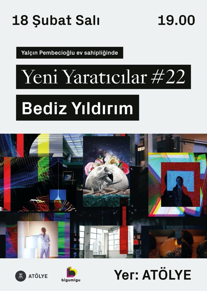18 Şubat Salı günü Bigumigu’nun eş-kurucusu ve yayın yönetmeni Yalçın Pembecioğlu ile sohbet formatında ve ATÖLYE’de gerçekleşecek olan Yeni Yaratıcılar etkinliği buluşmasında Bediz Yıldırım’ın bireysel olarak yaptığı işleri ve sektördeki çalışma hayatını kendisinden dinleyeceğiz.