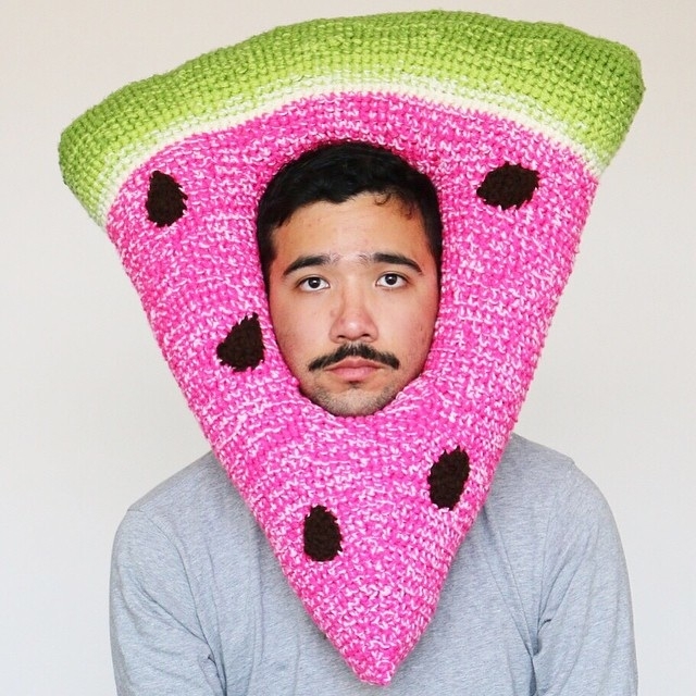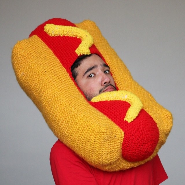 Melbourne’lu sanatçı ilhamını asıl çalıştığı yer olan Hamburgerciden almış. Restoranda çeşit çeşit yiyeceğin içinde tüm gününü geçirirken onları örüp kafasına geçirmek herhalde fazla kişinin aklına gelmez.