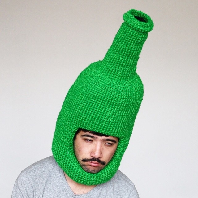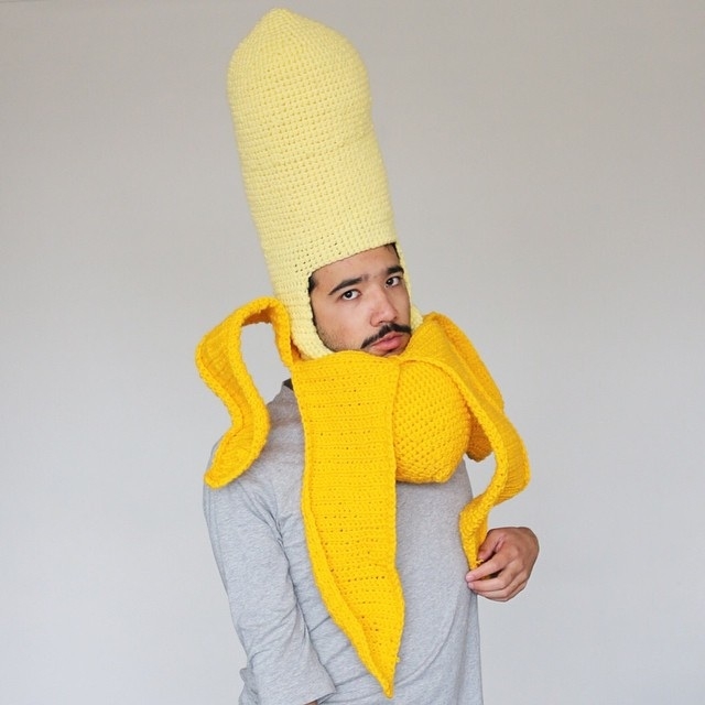 Devasa örgü şapkaların ortasındaki delikten kafanızı sokuyorsunuz ve bir elma-adama ya da donut- kadına dönüşüyorsunuz. Sadece şapkalar değil, fotoğraflarda şapkalarla poz veren Ferguson’un yüz ifadeleri de ayrıca eğlenceli.