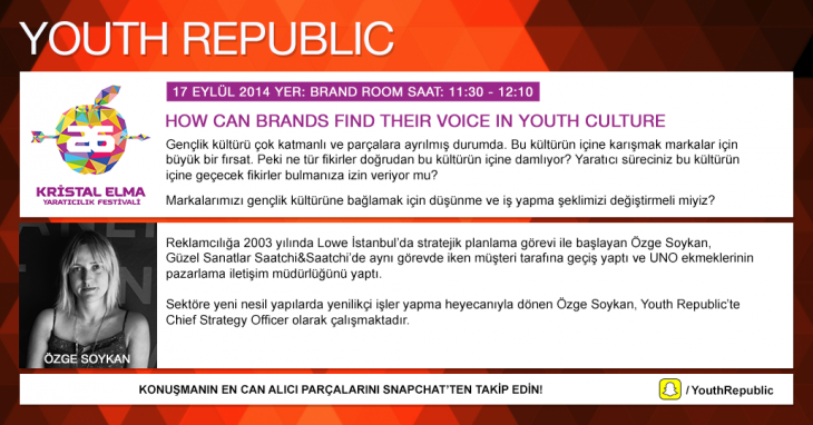 Tüm bu soruların yanıtlarını yarın (17 Eylül 2016) Kristal Elma’da saat 11.30’da Brand Room’da gerçekleşecek olan “How Brands Find Their Voice in Youth Culture” adlı oturumda Youth Republic’in Chief Strategy Officer’ı Özge Soykan’dan dinleyeceğiz.
