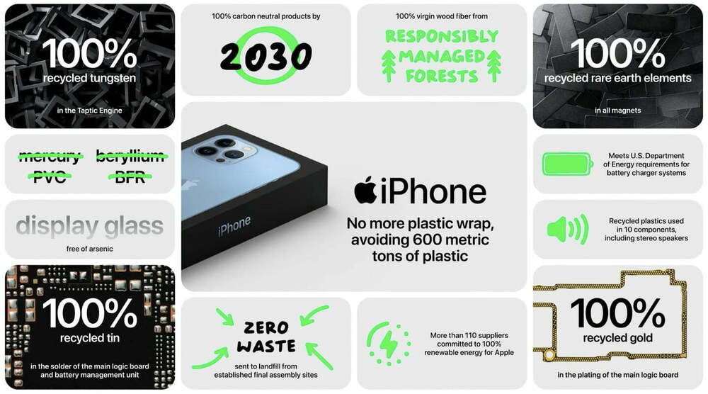 Apple, 2030 yılına kadar üretim tedarik zinciri ve ürün yaşam döngüleri de dahil tüm çalışmalarında iklim üzerindeki etkisinin net olarak sıfır olmasını planlıyor. 2025 yılına kadar ise tüm ambalajlarda plastik kullanımını tamamen sona erdirmeyi hedefliyor. Bu çevreci hedefler kapsamında pil yönetimi biriminde yüzde 100 geri dönüştürülmüş kalay kullanımı dahil olmak üzere ürünlerin çevre üzerindeki etkisi en aza indirilecek şejilde tasarlandı. iPhone 13 Pro ve iPhone 13 Pro Max modellerinde anakartın kaplamasında ve ön kamera ve arka kameralardaki kablolarda yüzde 100 geri dönüştürülmüş altın kullanılıyor. Yeniden tasarlanan ambalajın dış yüzeyinde streç film kullanılmaması, plastik kullanımının 600 metrik ton azaltıyor.