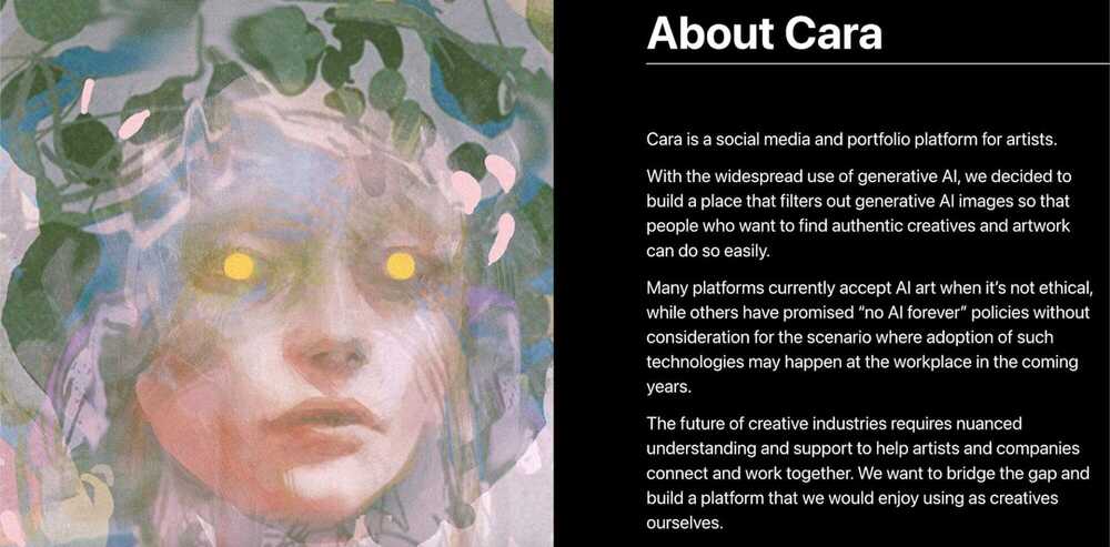 Birkaç ay önce kullanıma sunulan Cara adındaki yeni sosyal medya ve portfolyo uygulaması, sanatçıların orijinal çalışmalarını paylaşabilecekleri bir alan yaratmak ve platformda yasak olan yapay zekâ üretimini yakından takip etmek gibi iki yönlü bir hedefle ortaya çıktı. Cara’nın alt yapısına, Chicago Üniversitesi’ndeki SAND Laboratuvarı tarafından geliştirilen Glaze adlı araç entegre edilmiş. Glaze, üretken yapay zeka modellerinin eğitiminde stil taklitçiliğini bozarak insan sanatçıları koruyor. Böylece sanatçılar çalışmalarını yapay zeka içermeyen bir ortamda paylaşmakla kalmıyor; aynı zamanda platform, görüntülerin platform dışı güçler tarafından kopyalanmasını önlemek için aktif olarak çalışıyor.