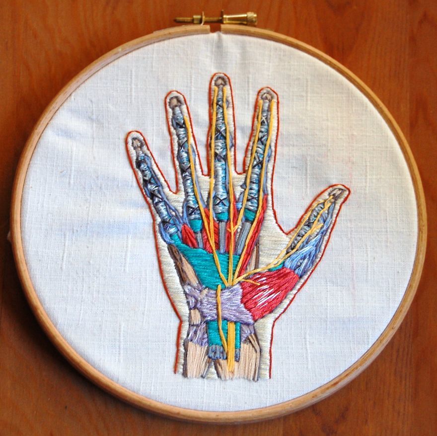 Postmodern nakışlar, nakış eskizler ve bozuk para büyüklüğünde nakışlar ve soyut nakışlar olmak üzere nakışın çağdaş versiyonlarını pek çok kez gündemimize aldık. Anatomi söz konusu olduğunda ise örgü hayvan anatomisi, buluntu objelerle yaratılan anatomik kesitler, kağıt telkari sanatıyla yaratılmış anatomik figürler gibi pek çok el emeği göz nuru örneğe yer verdik. Nakış ve anatomi konusunda hiçbir bilgisi olmayan Cath Janes ise 3 yıl önce geçirdiği yüz felci ameliyatları dolayısıyla hastanede kaldığı dönemde anatomiye ve nakış sanatına merak sarmış. Göğsünden alınan kasların sol yanağına ekleneceği bir operasyon döneminde, insan anatomisine olan hayranlığını dikiş tutkusuyla birleştirmeye karar vermiş.