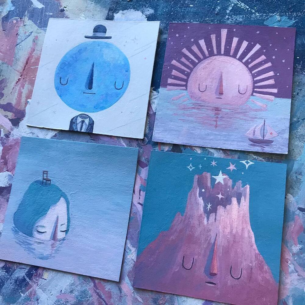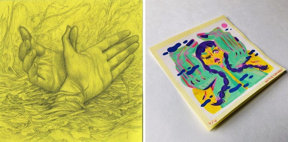 Katılan sanatçıların çoğu, doğrudan minyatür tuval üzerine boyamayı veya çizmeyi tercih ederken, bazıları 3. boyutu işin içine katarak heykelsi unsurlar eklemiş. Örneğin Sean Chao’nun çalışmasında, turuncu kağıttaki küçük bir delikten çıkan minik kilden bir rakun görüyoruz.