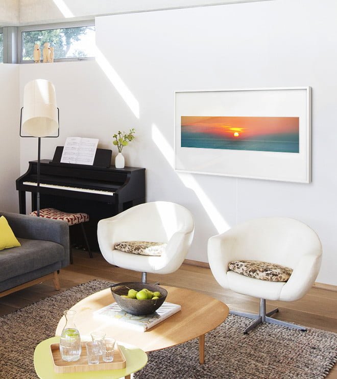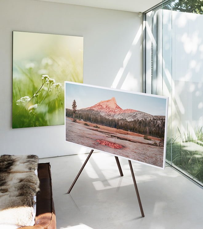 The Frame, duvarda asılı duran bir çerçeveden ayırt edilemeyecek görünüme sahip olabilmesi için Yves Behar’ın marifetli ellerine teslim edilmiş. Kullanıcı TV izlemediği zamanlarda, sanat moduna geçiyor ve cihazın ekranında sanat eserleri beliriyor. The Frame, hem 4K bir akıllı TV hem de bir dijital tuval olarak işlev görüyor, dolayısıyla görüntü kalitesi yüksek, gerçekçi görünüm sunan bir cihaz. Bu sayede ekrandaki eserler, gerçekten çerçevelenmiş resimler gibi görünüyorlar. TV’nin çerçevesi değiştirilebiliyor. Dolayısıyla kullanıcı; Tv’den ayrı olarak satışa sunulan siyah, beyaz, ceviz ve ahşap bej çerçeve seçeneklerinden dilediğini tercih edebiliyor.