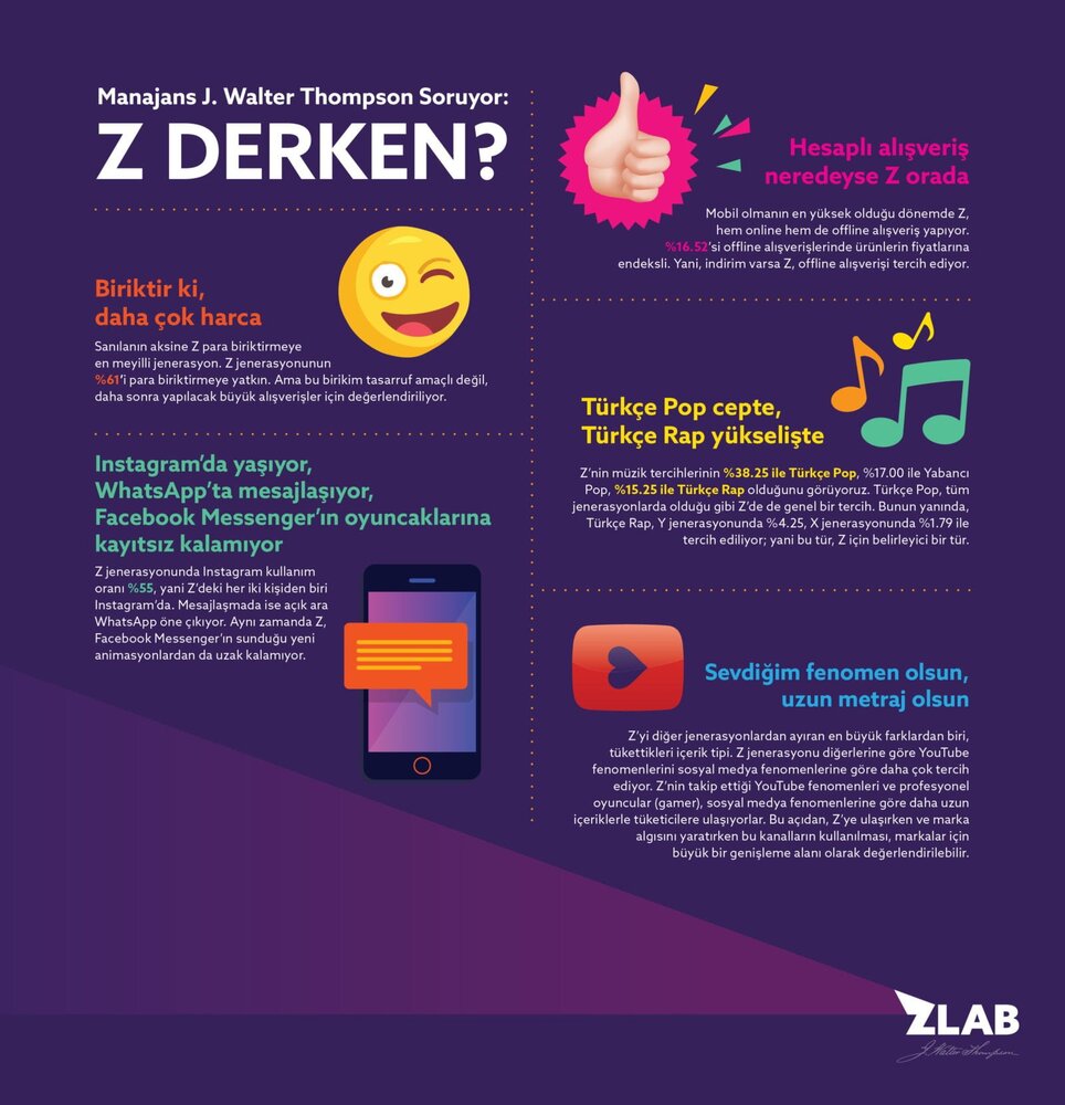 Pazarlama dünyası, Z nesli üzerine araştırmalar yapmaya devam ediyor. Türkiye’de de Z neslinin davranışlarını, eğilimlerini saptamak ve markalara iletişim stratejilerinde yeni jenerasyonun özelliklerini nasıl harmanlayacağını anlatmak üzere çalışmalara başlayan Manajans J. Walter Thompson, Joint Idea, Poltio, Twentify ve BuzzMyVideos’un destekleri ile ZLAB’in ilk toplantısı “ZLAB Presents: Young Side of Cannes 2018”i gerçekleştirdi.