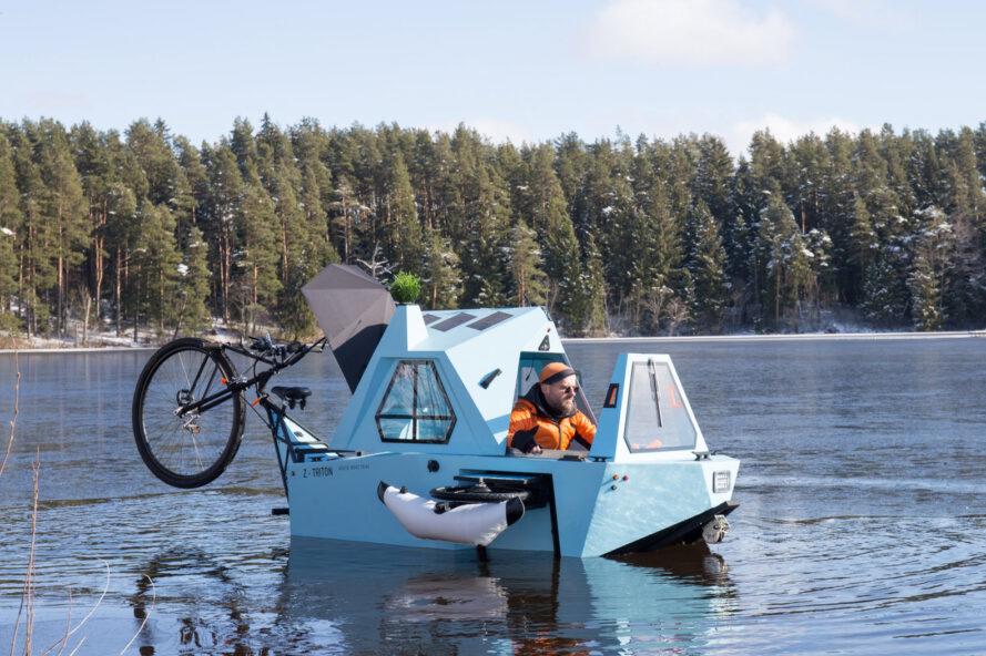 Z-Triton, ufak tefek görünse de 2 kişinin konaklayabileceği kapasitede bir araç. Hem kısa hem de uzun seyahatler için tasarlanmış. Karada 3 tekerli elektrikli bisiklet modunda gidiyor. Tekne moduna geçtiğinde tüm tekerler yukarı doğru yatay şekilde katlanıyor ve arka tekerlerin altına minik şişme dubalar ekleniyor. Z-Triton ile gölde ve nehirde seyahat etmek (10 km’ye kadar menzil) mümkün ancak denize ya da okyanusa açılmak için uygun bir araç olmadığını belirtelim.