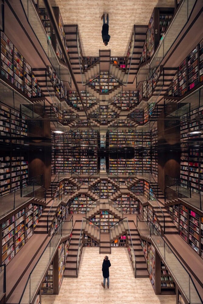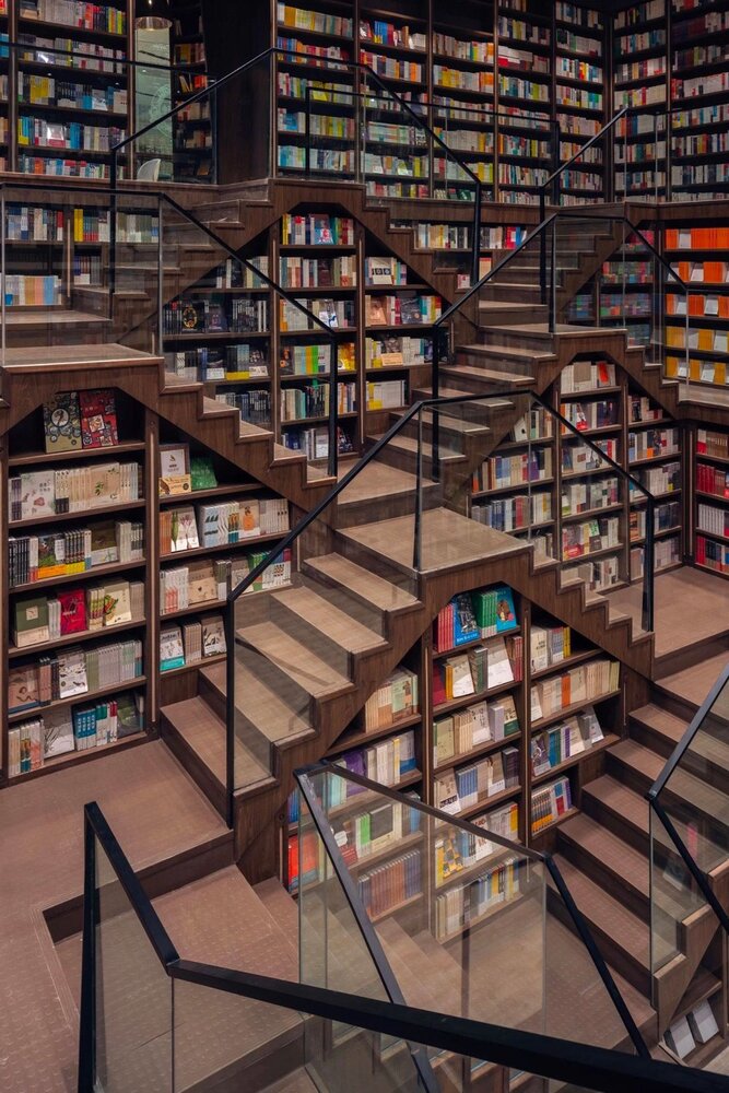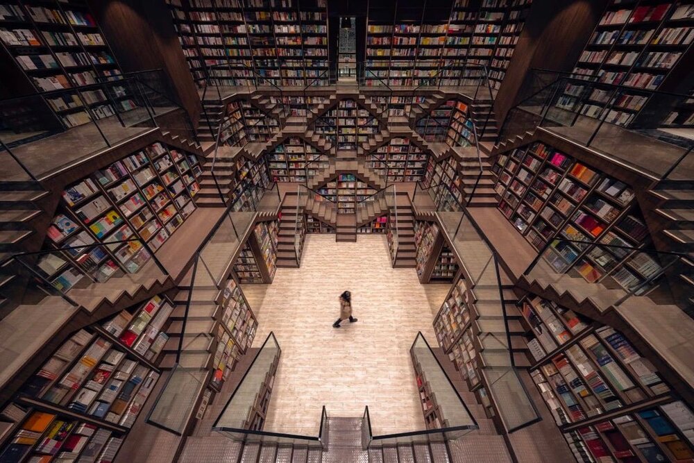Zhongshuge, Şanghay’da bulunan mimarlık stüdyosu X+Living tarafından tasarlanmış. Çin’in Jiangsu eyaletinde bulunan Yangzhou şehrinde yer alıyor. Hem kitap kurtlarının, hem mimari tasarımcıların hem de illüzyon meraklılarının ilgisini çekecek türden bir mekan. Aynalı zeminlerle ve çapraz merdivenlerle donatılmış. Paralel evrenlere açılıyormuş hissi veren aynalar, suyu temsil ediyor. Çünkü kitabevinin bulunduğu şehirde yetişen pek çok yazar ve şair şehirdeki su kanallarından, nehirlerden ve göllerden ilham almış. Kemerli cam tavanlar ve akıcı desenler insanlar ve kitaplar arasındaki bağlantıyı temsil ediyor. Yumuşak bir aydınlatmayla tamamlanan bu tasarım öğeleri, başka dünyalara özgü olağanüstü bir hava vermiş mimariye. X+Living, tasarımda hem Zhongshuge’nin tarihini selamlamış hem de gelecek nesillerden okurların kendini geliştirebileceği çekici bir alan yaratmayı hedeflemiş. Zhongshuge bir bakıma geçmişle gelecek arasında bir köprü olarak hayal edilmiş.