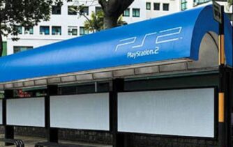 Sony Playstation 2 için otobüs duraklarına uygulanmış eski bir iş, baloncuklu naylon ve altına basılmış playstation ikonları, bunları patlatmayı sevmeyen bir